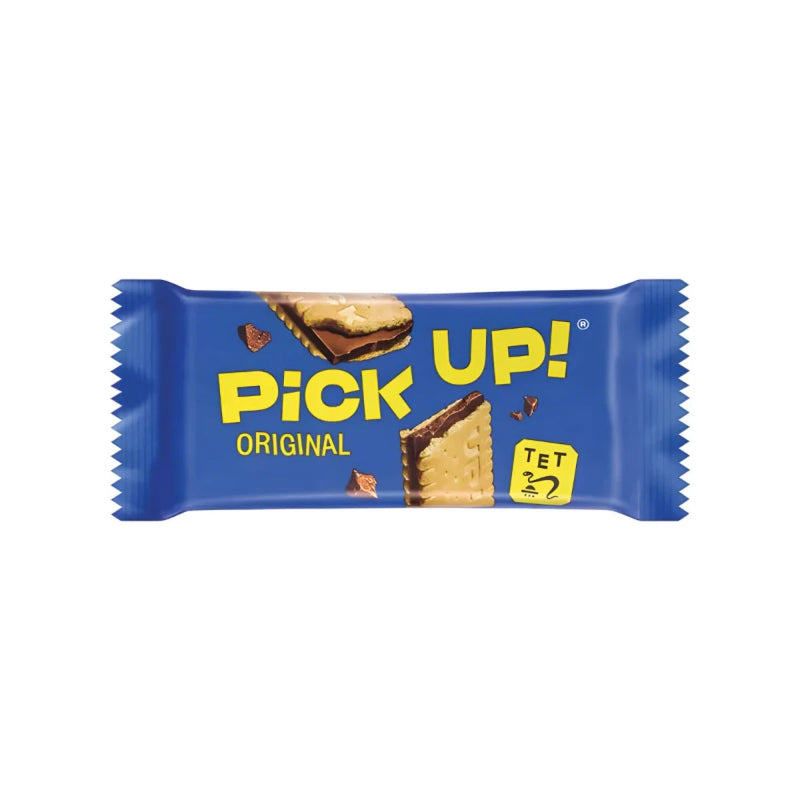 Knackiger Genuss für unterwegs! Der Bahlsen Pick-Up! Original Choco vereint zwei goldbraun gebackene Kekse mit einer dicken Schicht vollmundiger Schokolade – kein Cremefüllung, nur purer Crunch und Schoko. Perfekt für die schnelle Pause, als süßer Snack zwischendurch oder für die Lunchbox. Praktisch einzeln verpackt und immer frisch – der Klassiker, der einfach immer geht.